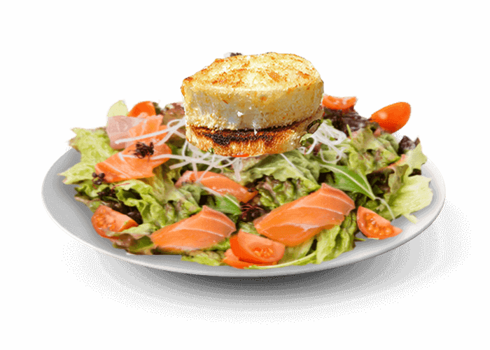 Salade verte, tomates, maïs, avocat, saumon, citron. Pain offert sur demande.